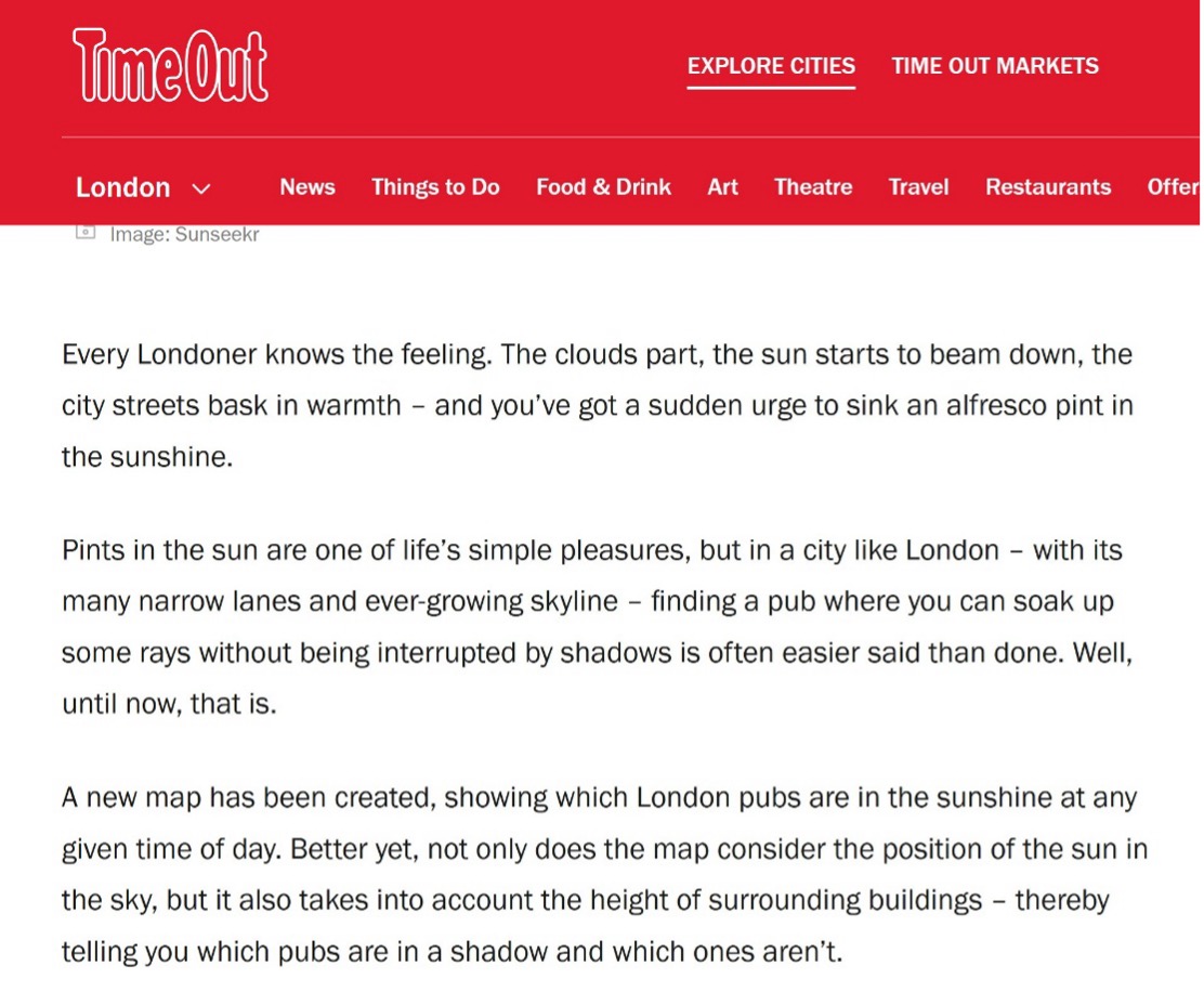 Simply put, the App maps out the details of which London pub gardens are in the sun, and which of them are in the shade. In real time. Plus there’s a time-bar slider so that you can project forward to understand what the future availability of the sun looks likes.